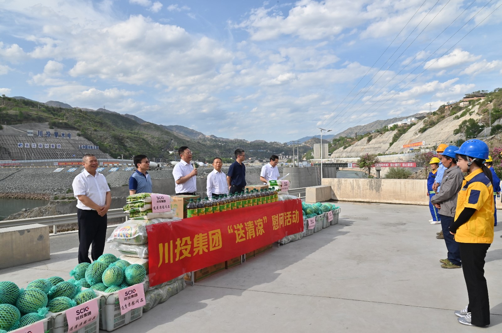 督导检查组深入康家沟渣场、大坝基坑施工现场,,,重点检查了攀水电公司“迎大运?保清静”集中整治、重大事故隐患专项排查整治、清静生产责任落实以及危害辨识管控情形,,,并代表集团公司慰问了攀水电公司及电站参建单位一线员工,,,为各人送上防暑降温物资。。。