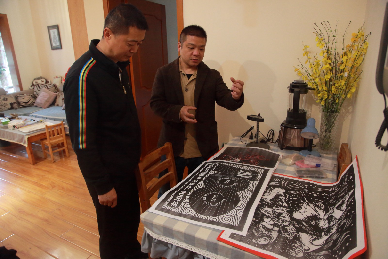 克日,,bm11222宝马娱乐网站能源党委副书记、工会主席杨超龙前往庄丛灿的创作室,,视察指导庆祝建党100周年剪纸作品展准备事情,,并将组织眷注带给辛勤创作中的庄丛灿。。。。。
