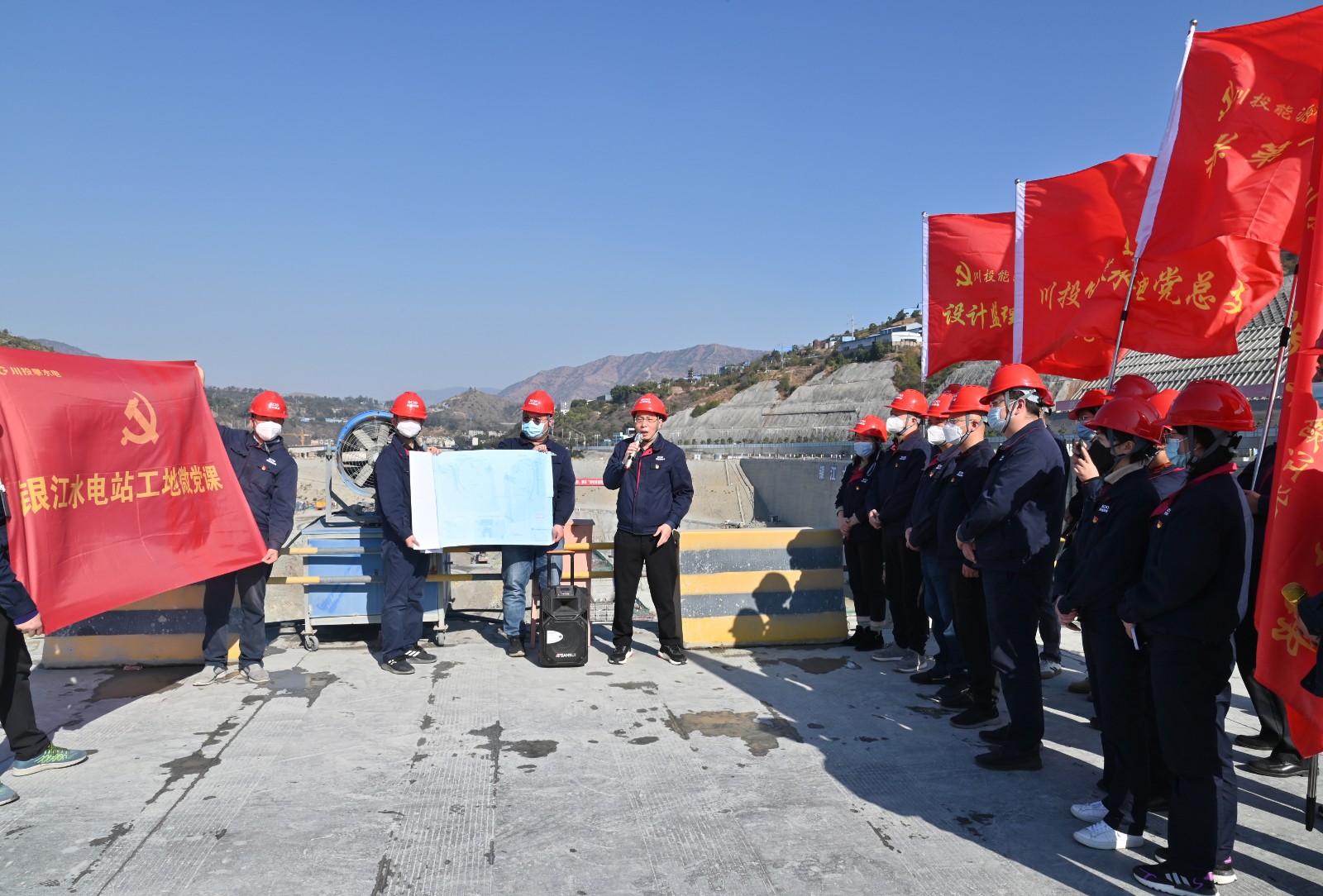 1月7日下昼,,在新春到来之际,,攀水电公司党总支组织在银江水电站施工现场开展了1月份主题党日运动,,机关第一党支部、机关第二党支部及各联建支部党员、自愿者等30余人加入了本次运动。。。bm11222宝马娱乐网站能源副总司理、攀水电公司党总支书记、董事长、攀新能源公司董事长徐孝刚加入本次运动并教学了一堂独具匠心的工地党课,,公司其余向导均以通俗党员身份加入了本次运动。。。
