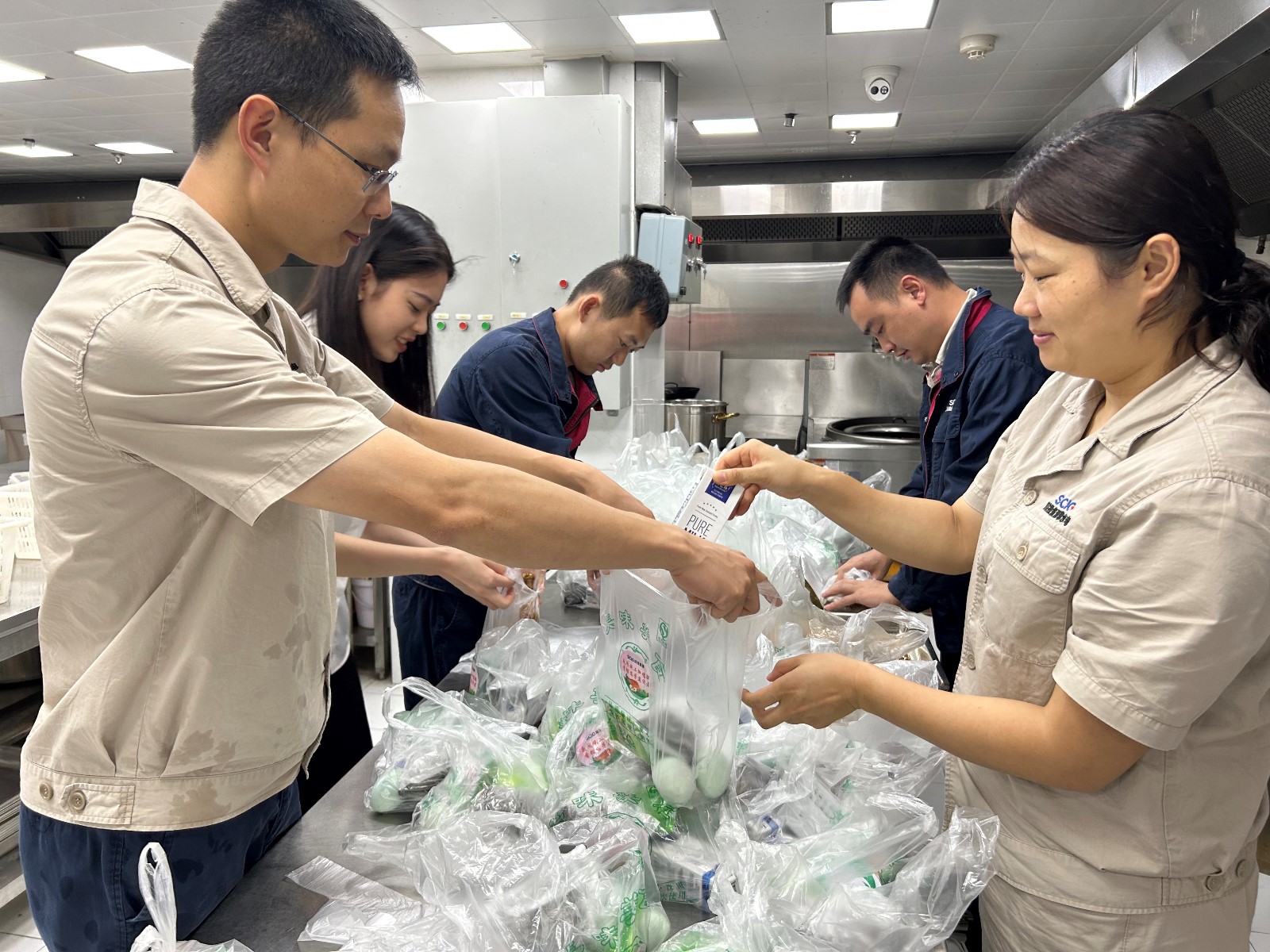 支部党员、自愿者们放弃了难堪的节日假期 ,,,,,下昼就在职工食堂忙碌了起来 ,,,,,卤鸡腿 ,,,,,蒸粽子 ,,,,,煮盐蛋 ,,,,,接纳流水线事情方法 ,,,,,把热乎乎的鸡腿、粽子、盐蛋、牛奶等提前举行分装 ,,,,,利便工友们在工地食用。。。 。 。