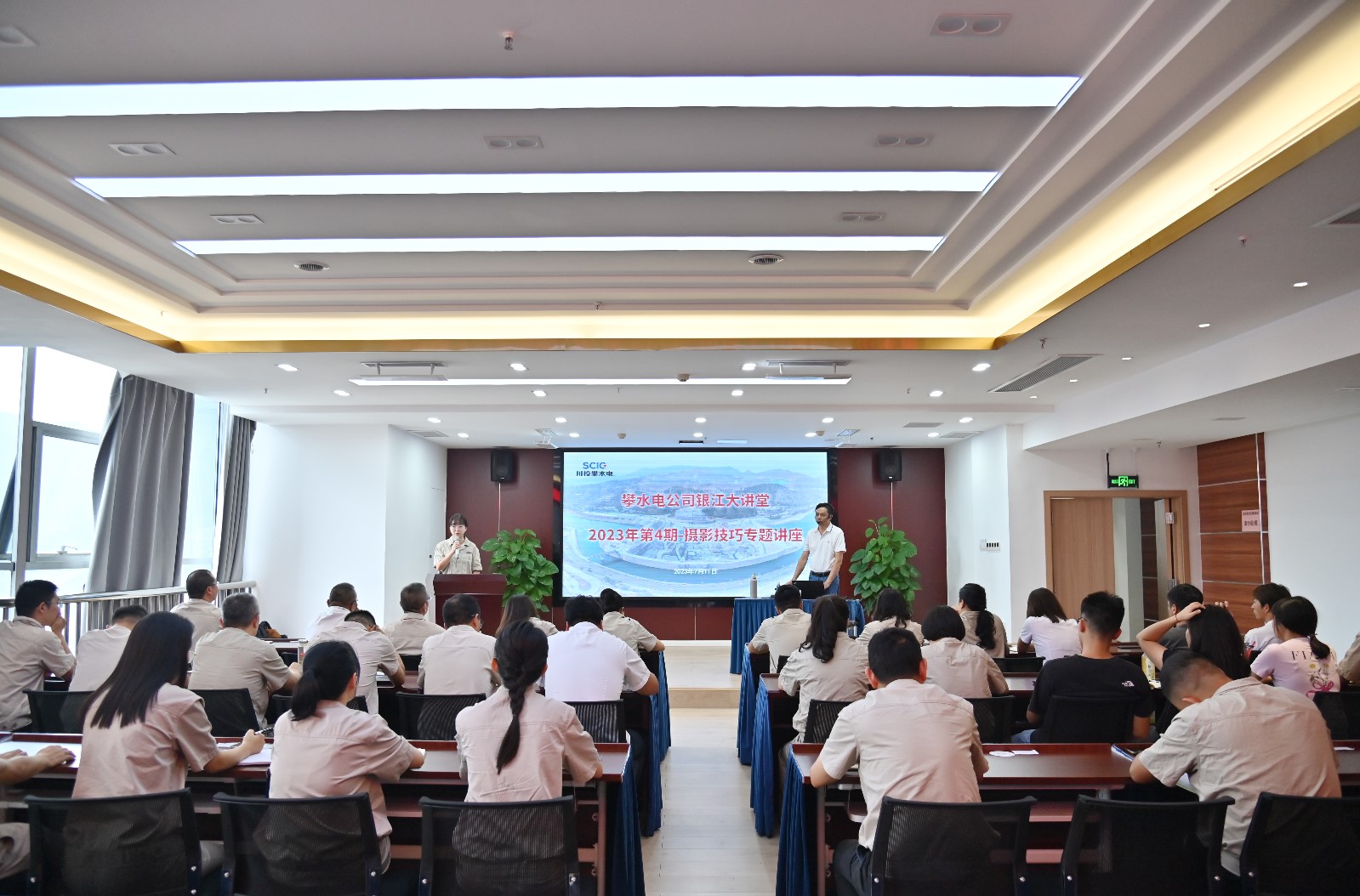 为切实提高公司员工的摄影手艺与水平,,,,提升公司新闻宣传质量,,,,更好的捕获银江水电站建设的每个里程碑节点的主要瞬间和建设者的汗水与效果,,,,7月11日,,,,攀水电公司举行2023年第四期“银江大课堂”摄影技巧专题培训,,,,约请了攀枝花市职工摄影家协会主席、攀枝花市总工会职工才艺培训摄影班赵鸥先生主讲,,,,公司各部分及各参建单位相关职员共30余人加入。。