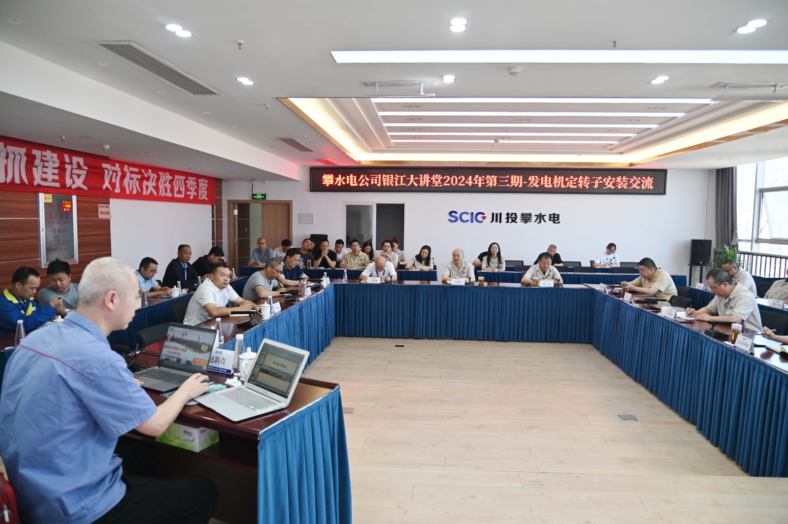 在银江水电站主厂房桥机顺遂装置完成,,,,,即将举行水轮发电机组定转子组装之际,,,,,攀水电公司约请哈尔滨电机厂有限责任公司高级工程师赵新青,,,,,在银江大课堂上给公司各部分及各参建单位,,,,,作了题为《发电机定转子装置》的手艺交流课,,,,,公司向导、各部分及各参建单位相关职员共30余人加入培训。。。