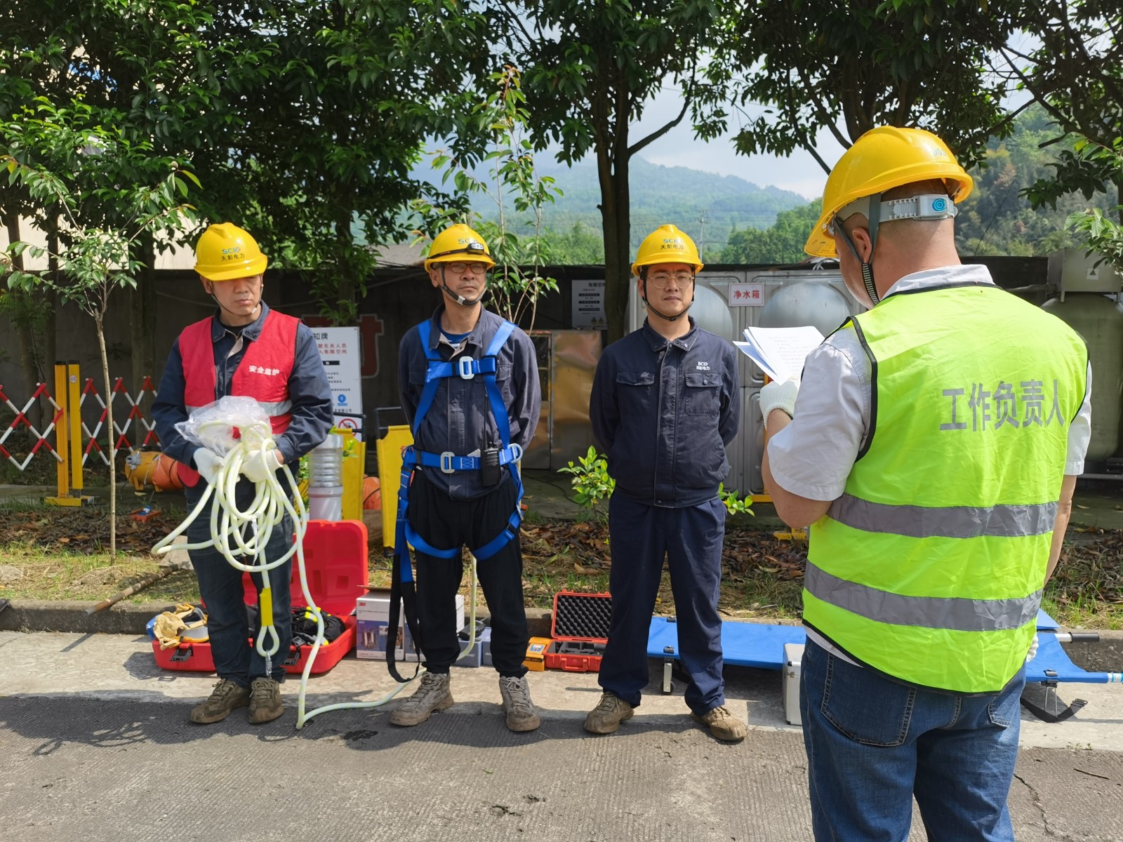 随后,,,在公司办公楼侧化粪池园地开展了有限空间作业及中毒窒息事故现场处置惩罚实战演练。。首先明确各组职员分工、职责及事情流程,,,并做好物资清点和自检互检,,,作业历程严酷凭证“先透风、再检测、后作业”的原则,,,每一步都井然有序举行。。演练模拟作业职员缺氧窒息“险情”,,,迅速启动应抢救援预案并实验救援程序。。各组职员按职责分工配合、高效运转,,,救援职员严酷配备正压式空气呼吸器、清静带等防护步伐,,,准确使用应抢救援装备,,,在监护职员的清静监护下,,,冷静应对、科学施救,,,乐成完成了对“伤者”的实时转移和紧抢救护。。