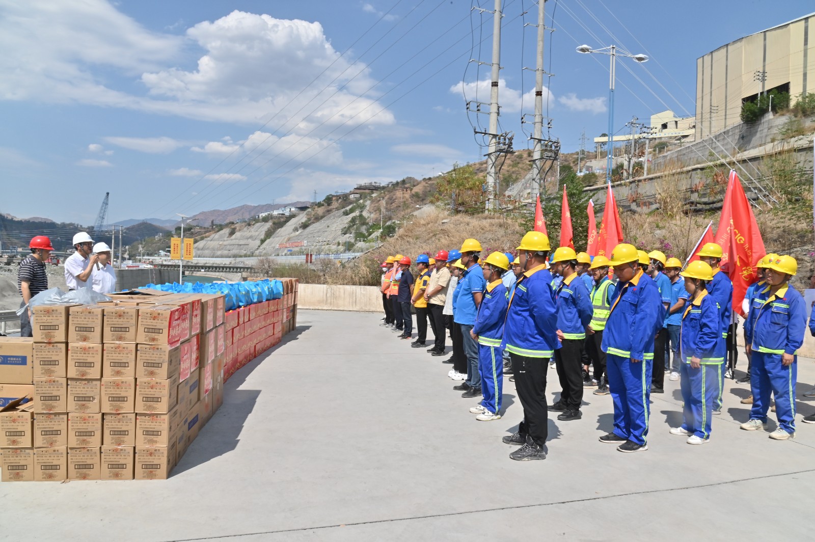 随后,,,,,凌永航一行向银江水电站现场各参建单位的一线工友们送上了清凉饮品、洗衣液、洗发露等400余份清凉物资,,,,,嘱咐工友在烈日烘烤的事情中,,,,,一定要周全做好种种防护步伐,,,,,注重防暑降温,,,,,合理安排事情时间,,,,,注重自身清静和康健。。。。
