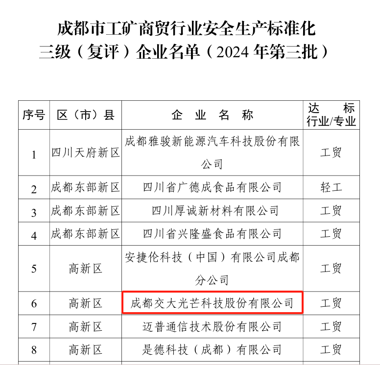 2024Äê9Ô£¬£¬£¬³É¶¼»áÓ¦¼±¾ÖÐû²¼¡¶¹ØÓÚÐû²¼³É¶¼»á¹¤¿óÉÌóÐÐÒµÇå¾²Éú²ú±ê×¼»¯Èý¼¶£¨¸´ÆÀ£©ÆóÒµÃûµ¥£¨2024ÄêµÚÈýÅú£©µÄ֪ͨ¡·£¬£¬£¬½»´ó¹âÏßͨ¹ýÇå¾²Éú²ú±ê×¼»¯Èý¼¶´ï±ê¸´ÆÀ¡£¡£¡£¡£