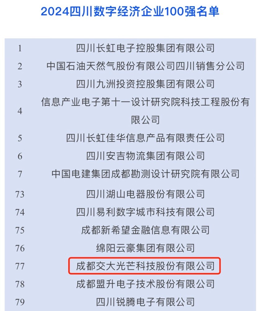 9月26日,,四川大企业大集团生长大会在成都召开,,会上,,四川省企业联合会宣布了2024年四川企业100强、制造业100强、效劳业100强和数字经济100强榜单,,交大光线荣登四川数字经济企业100强榜单,,位列第77位。。。