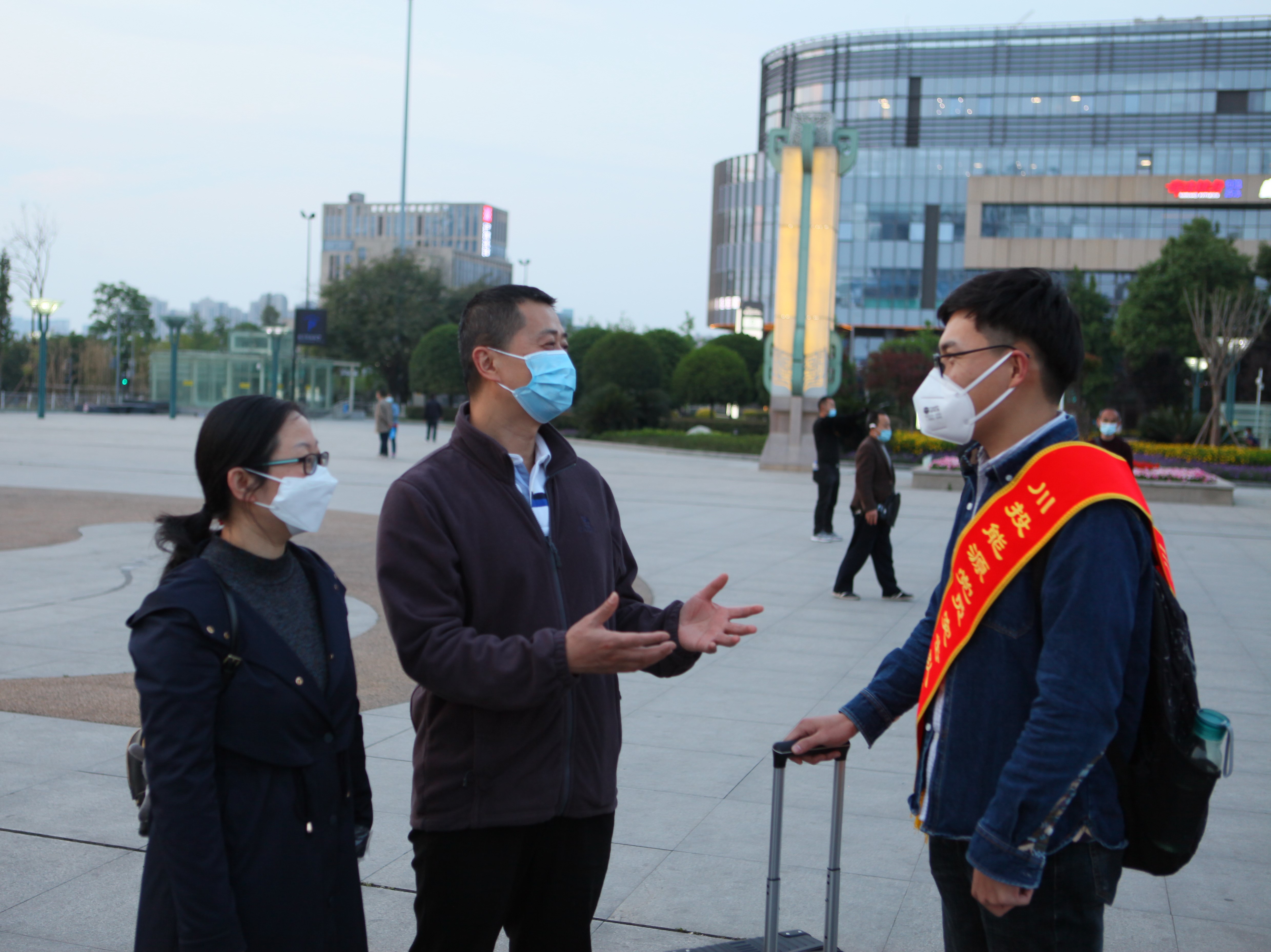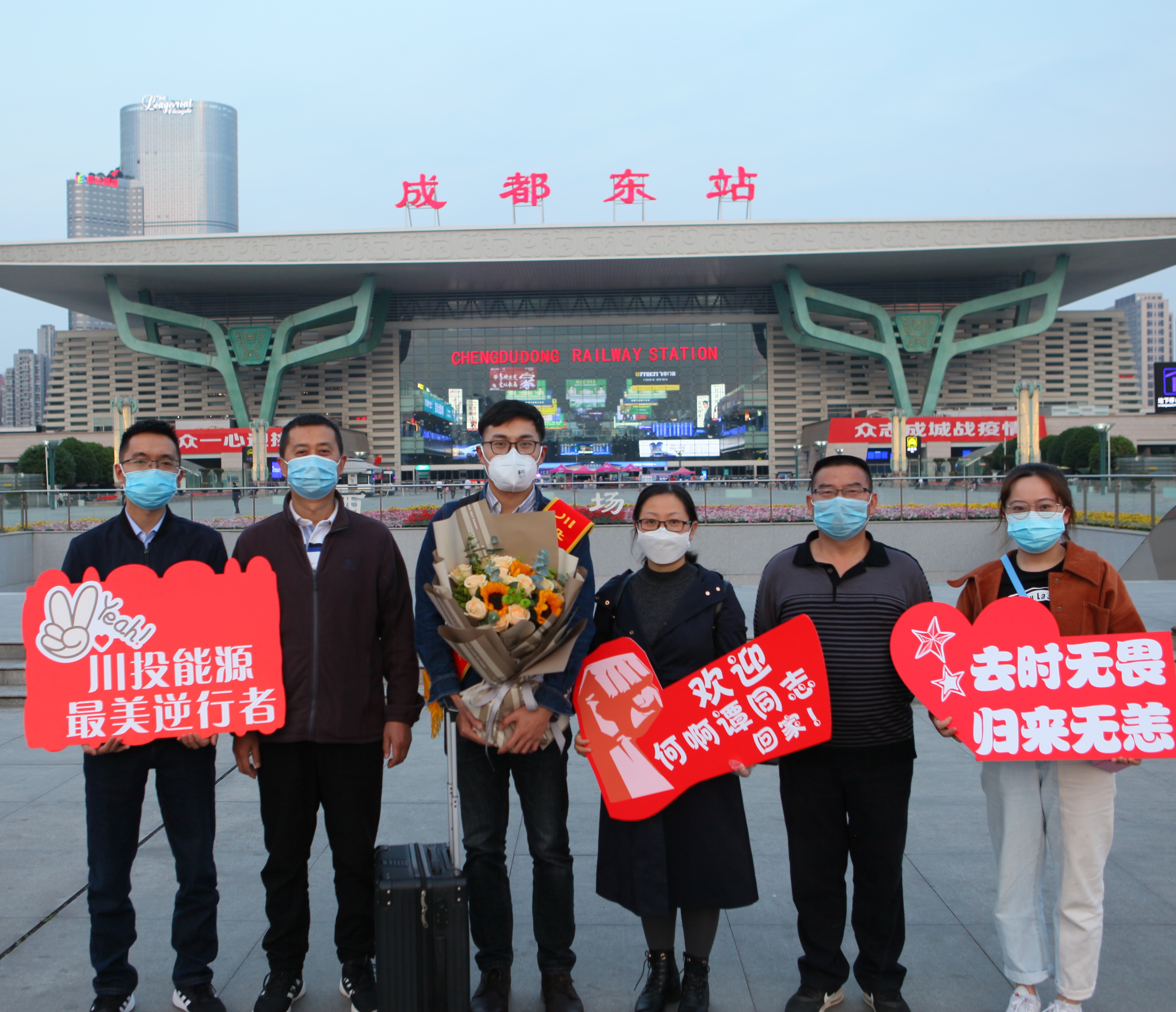 4月25日,,,bm11222宝马娱乐网站能源 “最美逆行者”、交大光线工程突击队队员何啊潭同志圆满完成在武汉铁路局的值守使命,,,带着胜利清静安凯旋归来。。bm11222宝马娱乐网站能源党委副书记、工会主席杨超龙与党群事情部主任杨鑫以及交大光线党总支委员汪志桥一道,,,手捧鲜花,,,到成都东站迎接bm11222宝马娱乐网站能源“最美逆行者”回家。。